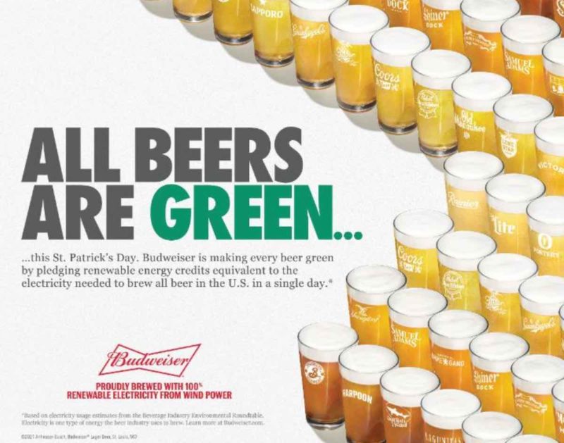 US beer brand pledges to ensure every beer brewed in America on March 17 is offset with renewable energy credits and sets “green electricity beer bar” for industry.