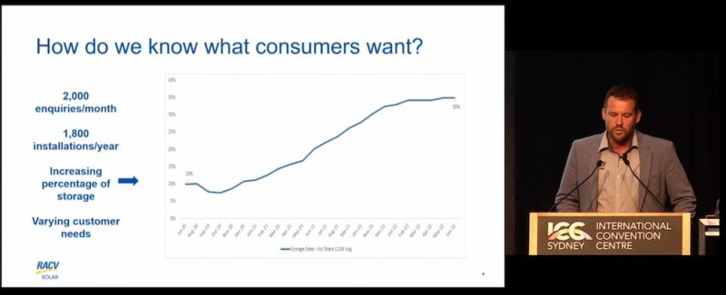 McCarthy’s chart shows the percentage of RACV Solar installations that include a battery, starting in 2020 and running up until June of this year, when just under 50% of the solar systems the company is installing were paired with a battery.