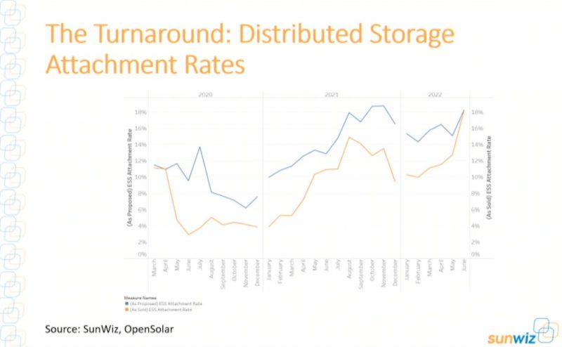 That jump in the so-called “attachment rate” for batteries is illustrated in the SunWiz chart, which shows what percentage of PV systems are getting storage system attached over the past couple of years.