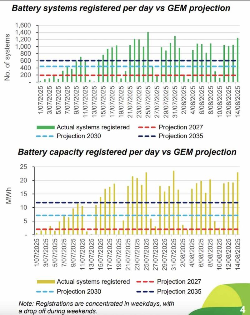 “Since mid-July the average daily number of battery systems being registered (including weekends) has been running above 800,” it adds, compared to around 156 systems being installed per day in 2023.