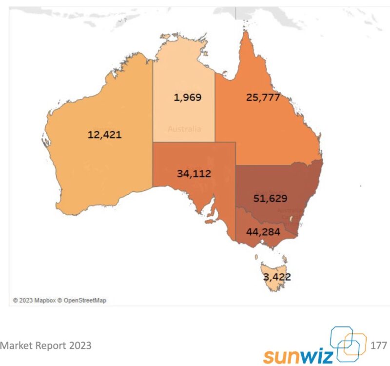 On a state-by-state basis, New South Wales leads the nation on the cumulative number of behind-the-meter batteries installed to date with 51,629 (see map below) of the national total.