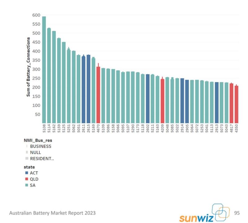 The chart below shows the top 40 postcodes in the nation for battery connections according to the DERR, with a “leaderboard dominated by SA,” SunWiz says, and a small number of Queensland and ACT postcodes in the mix.