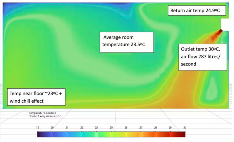 While, in principle, an RCAC can provide effective and very efficient space heating, significant numbers of consumers complain that they don’t feel comfortable. A study I and RMIT colleagues published in 2023 showed that the lived experience of people in poorly insulated, thermally leaky rooms, feeling cold drafts, was consistent with the laws of physics, as shown below.