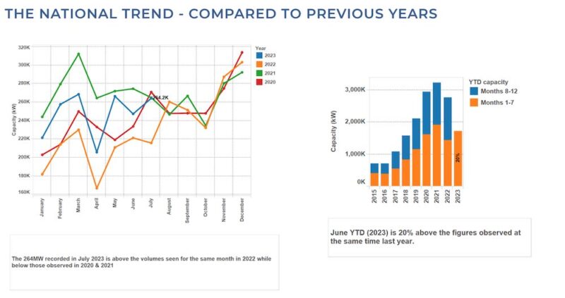 Commercial installs (15-100kW) are trending up, however, putting overall volumes for the month slightly ahead of July 2022 – and on par with 2021, but below 2020. The market year-to-date figures are 20% ahead of the volumes seen at the same time last year.