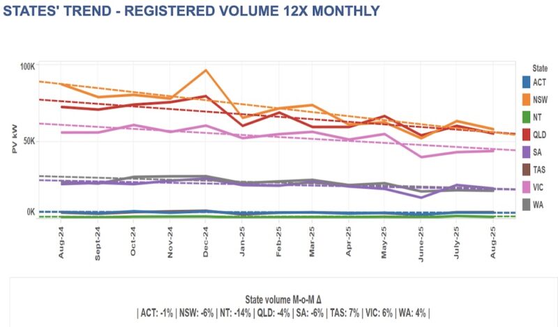 In NSW, which still topped the charts for installations, added a total of 58 MW of new capacity in August 2025, down from 64 MW in July.