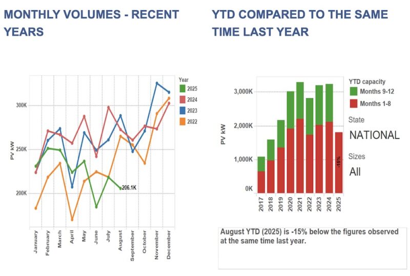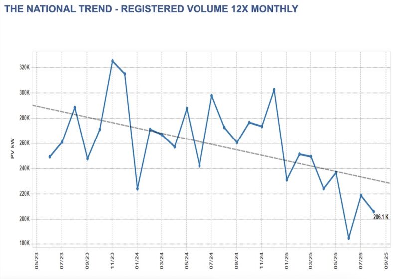 According to SunWiz, a total of 206 megawatts (MW) of new rooftop solar capacity was registered nationwide in August, harking back to levels not seen since 2022 and setting the market 15 per cent behind this time last year.