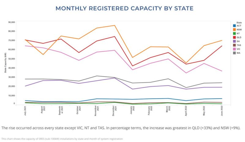 SunWiz reports a 33% increase in small-scale solar installations in Queensland for the month of June, compared to a 9% increase in NSW. In Victoria, though, installations decreased in June, while the other states and territories remained flat.