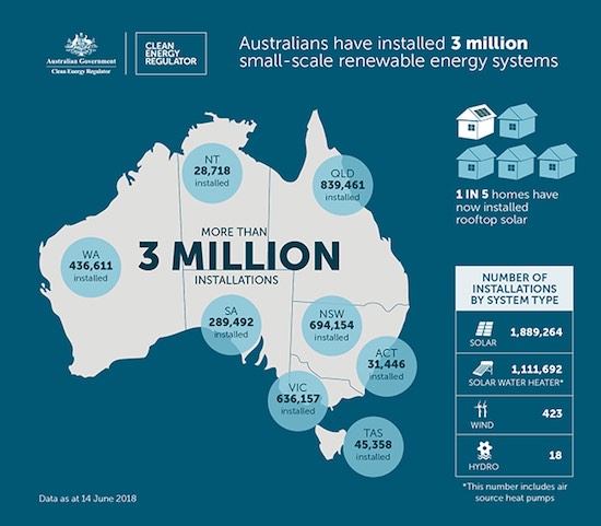 Small-scale solar systems installed by Australian homes and businesses have passed the three million-mark, with one in five homes now generating their own power.